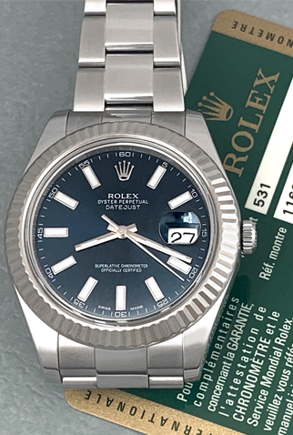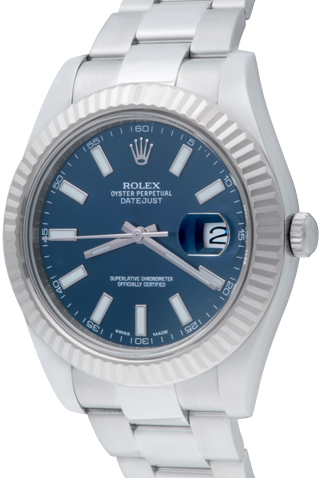 Case Material: Stainless Steel case with 18k White Gold fluted bezel (41mm dia.)